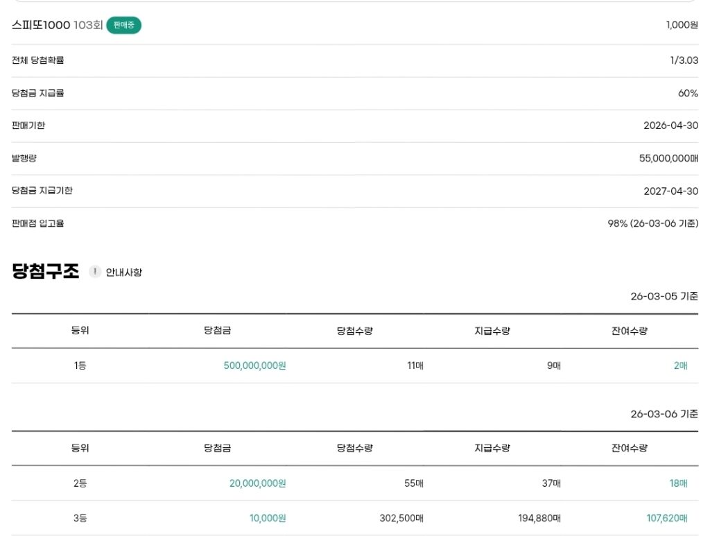 스피또1000 복권 103회 출고율(판매점 입고율)은 98%입니다. 잔여수량은 아래 이미지를 참고하세요.