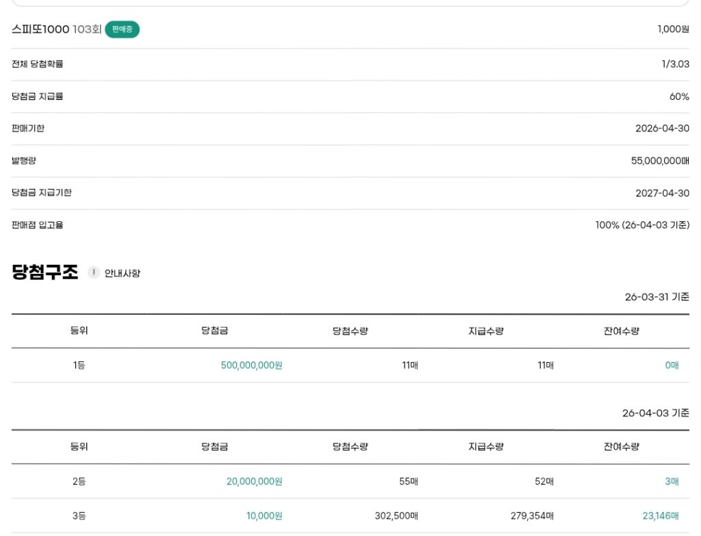 스피또1000 복권 103회 출고율(판매점 입고율)은 100%입니다. 잔여수량은 아래 이미지를 참고하세요.