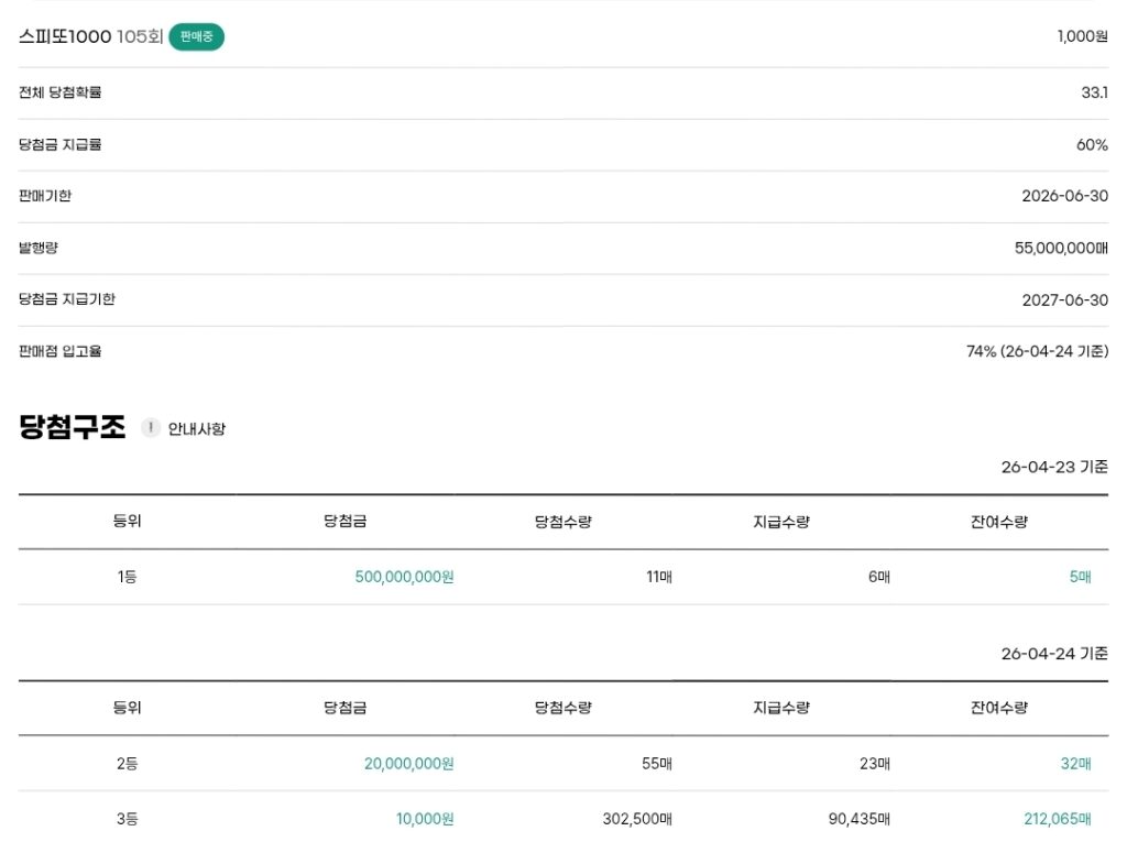 스피또1000 복권 105회 출고율(판매점 입고율)은 74%입니다. 잔여수량은 아래 이미지를 참고하세요.