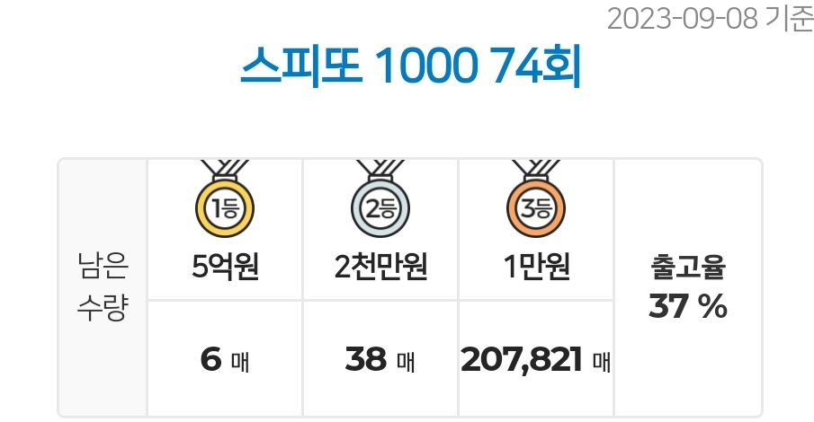 - 스피또1000 74회 1등 남은 수량 및 출고율 (2023.09.08 기준)