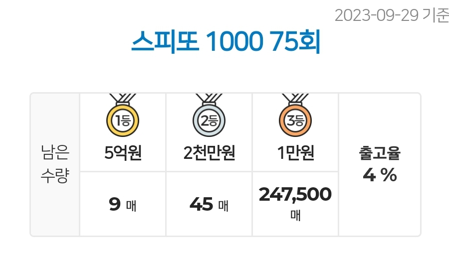 스피또1000 복권 75회 남은수량 1등 9매(총 9매 중), 2등 45매(총 45매 중), 3등 247,500매(총 247,500매 중)가 남아 있습니다. 출고율은4%입니다. 출고율의 의미와 당첨확률을 높이는 방법은 스피또 당첨확율을 높이는 방법은? 구입전에 출고율과 남은 수량을 확인은 필수! 포스팅을 참고하세요.
