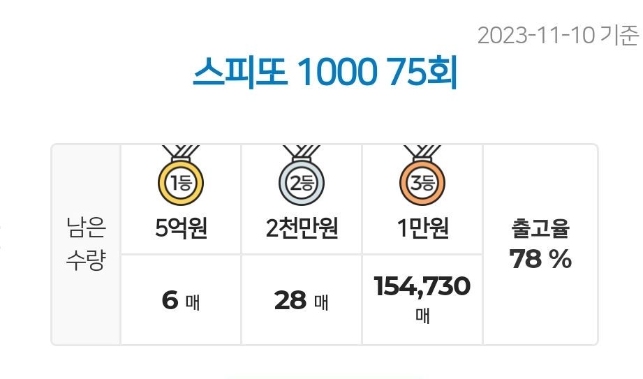 스피또1000 75회 출고율 / 스피또1000 75회 당첨현황(2023.11.10 기준)