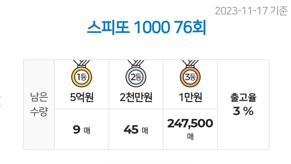 스피또1000 76회 출고율 / 스피또1000 76회 당첨현황(2023.11.17 기준)