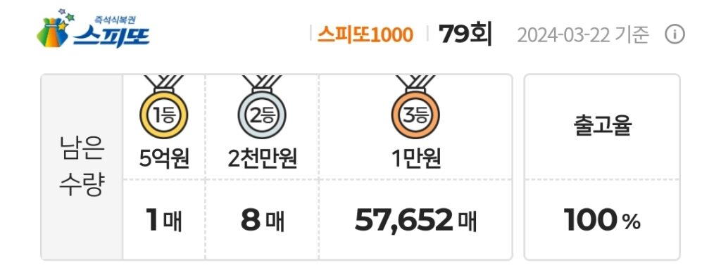 스피또1000 79회 1등 남은 수량 및 출고율 정보 및 당첨현황 정보입니다.