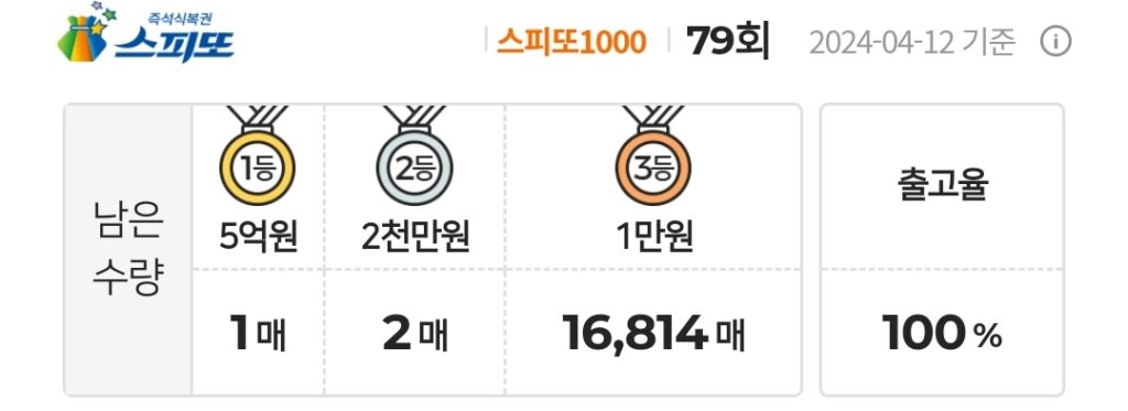 스피또1000 79회 1등 남은 수량 및 출고율 정보 및 당첨현황 정보입니다.