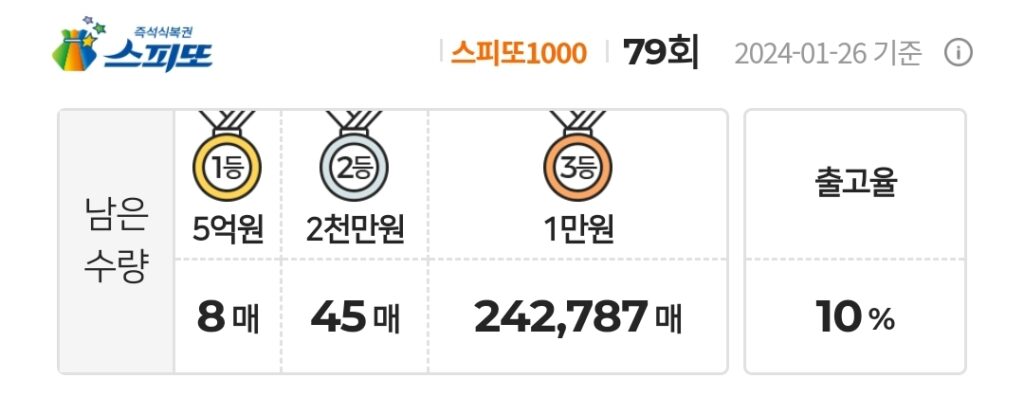 스피또1000 79회 1등 남은 수량 및 출고율 정보 및 당첨현황 정보입니다.