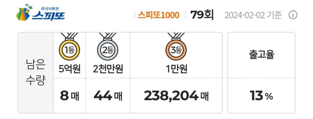 스피또1000 79회 1등 남은 수량 및 출고율 정보 및 당첨현황 정보입니다.
