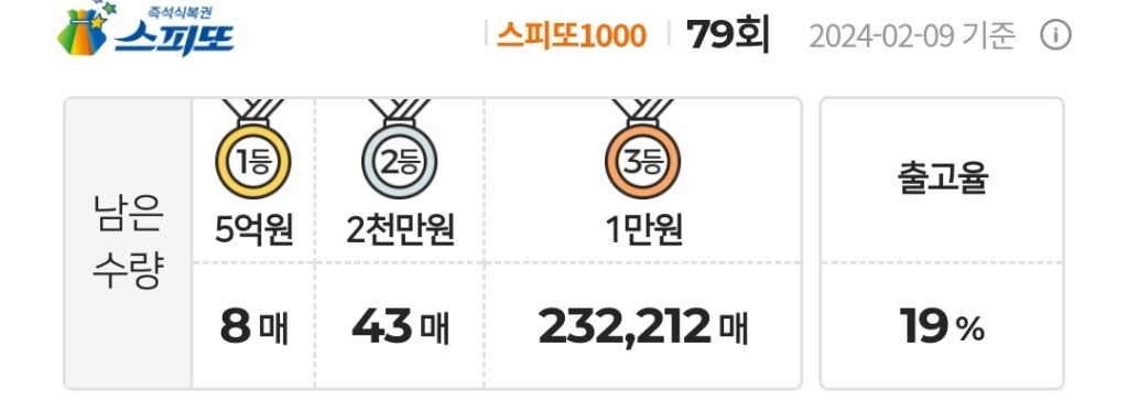 스피또1000 79회 1등 남은 수량 및 출고율 정보 및 당첨현황 정보입니다.