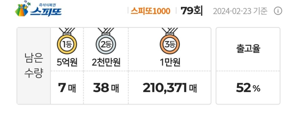 스피또1000 79회 1등 남은 수량 및 출고율 정보 및 당첨현황 정보입니다.