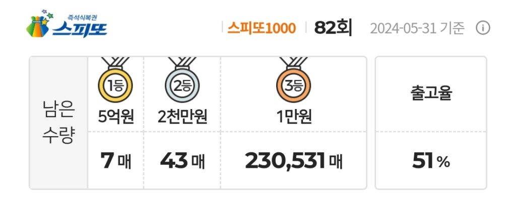 스피또1000 82회 1등 남은 수량 출고율 정보 및 당첨현황 정보입니다.