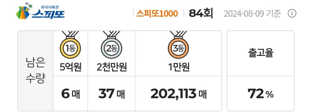 스피또1000 복권 84회 남은수량 1등 6매(총 9매 중), 2등 37매(총 45매 중), 3등 202,113매(총 247,500매 중)가 남아 있습니다. 출고율(판매점 입고율)은 72%입니다. 출고율의 의미와 당첨확률을 높이는 방법은 스피또 당첨확율을 높이는 방법은? 구입전에 출고율과 남은 수량을 확인은 필수! 포스팅을 참고하세요.
