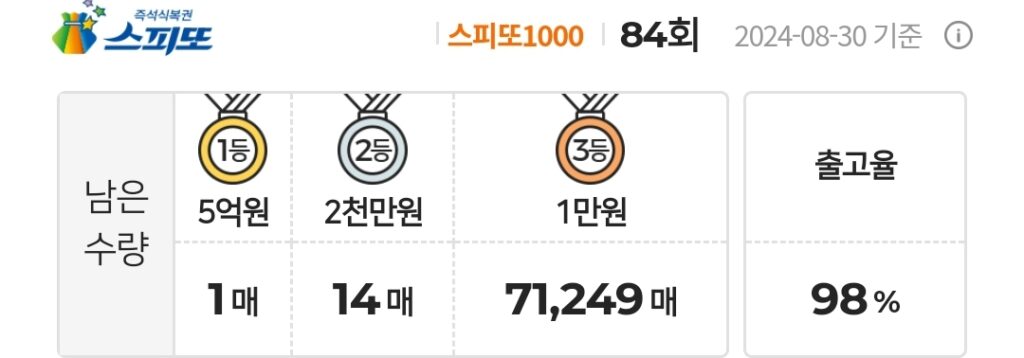 스피또1000 84회 1등 남은 수량 출고율 정보 및 당첨현황 정보입니다.