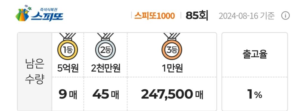 스피또1000 복권 85회 남은수량 1등 9매(총 9매 중), 2등 45매(총 45매 중), 3등 247,500매(총 247,500매 중)가 남아 있습니다. 출고율(판매점 입고율)1%입니다. 출고율의 의미와 당첨확률을 높이는 방법은 스피또 당첨확율을 높이는 방법은? 구입전에 출고율과 남은 수량을 확인은 필수! 포스팅을 참고하세요.