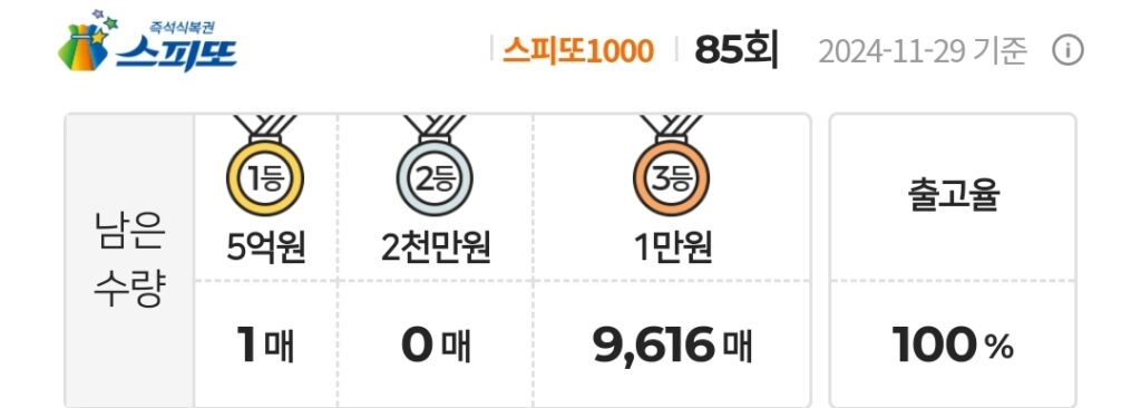 스피또1000 복권 85회 남은수량 1등 1매(총 9매 중), 2등 0매(총 45매 중), 3등 9,616매(총 247,500매 중)가 남아 있습니다. 출고율(판매점 입고율)100%입니다. 출고율의 의미와 당첨확률을 높이는 방법은 스피또 당첨확율을 높이는 방법은? 구입전에 출고율과 남은 수량을 확인은 필수! 포스팅을 참고하세요.