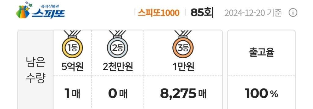 스피또1000 85회 1등 남은 수량 출고율 정보 및 당첨현황 정보입니다.