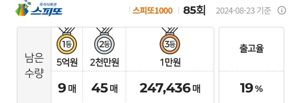 스피또1000 85회 1등 남은 수량 출고율 정보 및 당첨현황 정보입니다.