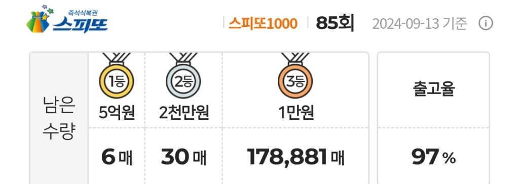 스피또1000 85회 1등 남은 수량 출고율 정보 및 당첨현황 정보입니다.