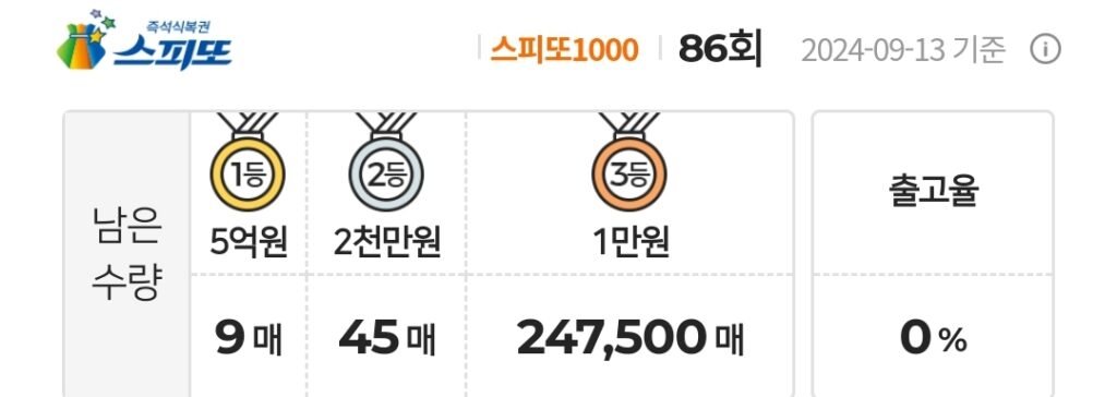 스피또1000 복권 86회 남은수량 1등 9매(총 9매 중), 2등 45매(총 45매 중), 3등 247,500매(총 247,500매 중)가 남아 있습니다. 출고율(판매점 입고율)은 0%입니다. 출고율의 의미와 당첨확률을 높이는 방법은 스피또 당첨확율을 높이는 방법은? 구입전에 출고율과 남은 수량을 확인은 필수! 포스팅을 참고하세요.