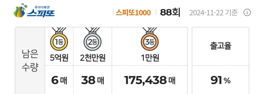 스피또1000 복권 88회 남은수량 1등 6매(총 9매 중), 2등 38매(총 45매 중), 3등 175,438매(총 247,500매 중)가 남아 있습니다. 출고율(판매점 입고율)은 91%입니다. 출고율의 의미와 당첨확률을 높이는 방법은 스피또 당첨확율을 높이는 방법은? 구입전에 출고율과 남은 수량을 확인은 필수! 포스팅을 참고하세요.
