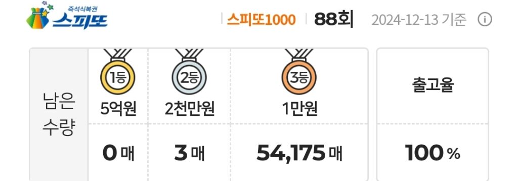 스피또1000 복권 88회 남은수량 1등 1매(총 9매 중), 2등 3매(총 45매 중), 3등 54,175매(총 247,500매 중)가 남아 있습니다. 출고율(판매점 입고율)은 100%입니다. 출고율의 의미와 당첨확률을 높이는 방법은 스피또 당첨확율을 높이는 방법은? 구입전에 출고율과 남은 수량을 확인은 필수! 포스팅을 참고하세요.