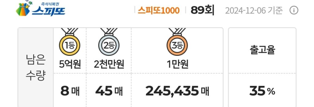 스피또1000 복권 89회 남은수량 1등 8매(총 9매 중), 2등 45매(총 45매 중), 3등 245,435매(총 247,500매 중)가 남아 있습니다. 출고율(판매점 입고율)은 35%입니다. 출고율의 의미와 당첨확률을 높이는 방법은 스피또 당첨확율을 높이는 방법은? 구입전에 출고율과 남은 수량을 확인은 필수! 포스팅을 참고하세요.