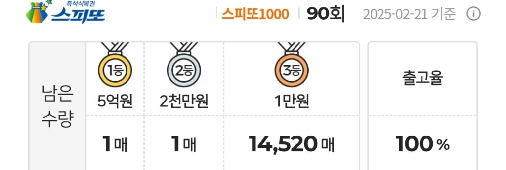 스피또1000 복권 90회 남은수량 1등 1매(총 6매 중), 2등 1매(총 30매 중), 3등 14,520매(총 165,000매 중)가 남아 있습니다. 출고율(판매점 입고율)은 100%입니다. 출고율의 의미와 당첨확률을 높이는 방법은 스피또 당첨확율을 높이는 방법은? 구입전에 출고율과 남은 수량을 확인은 필수! 포스팅을 참고하세요.