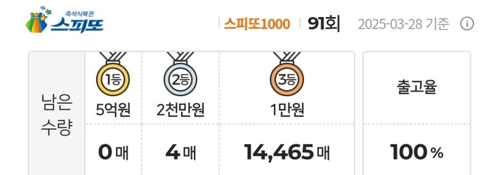 스피또1000 복권 91회 남은수량 1등 0매(총 9매 중), 2등 4매(총 45매 중), 3등 14,465매(총 247,500매 중)가 남아 있습니다. 출고율(판매점 입고율)은 100%입니다. 출고율의 의미와 당첨확률을 높이는 방법은 스피또 당첨확율을 높이는 방법은? 구입전에 출고율과 남은 수량을 확인은 필수! 포스팅을 참고하세요.