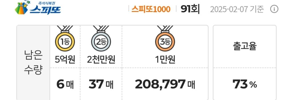스피또1000 복권 91회 남은수량 1등 6매(총 9매 중), 2등 37매(총 45매 중), 3등 208,797매(총 247,500매 중)가 남아 있습니다. 출고율(판매점 입고율)은 73%입니다. 출고율의 의미와 당첨확률을 높이는 방법은 스피또 당첨확율을 높이는 방법은? 구입전에 출고율과 남은 수량을 확인은 필수! 포스팅을 참고하세요.