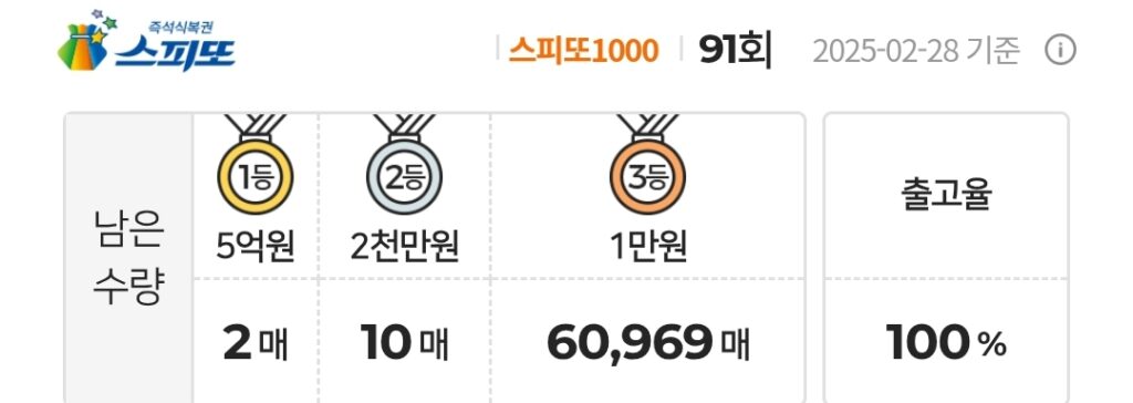 스피또1000 91회 1등 남은 수량 출고율 정보 및 당첨현황 정보입니다.