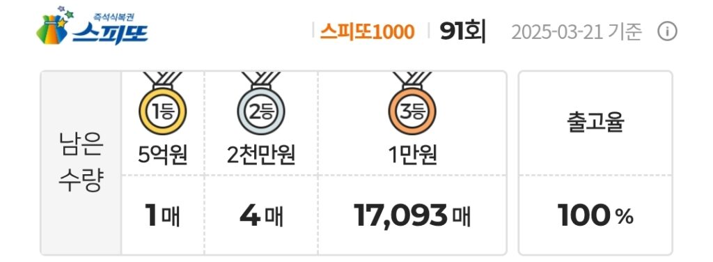 스피또1000 복권 91회 남은수량 1등 1매(총 9매 중), 2등 4매(총 45매 중), 3등 17,093매(총 247,500매 중)가 남아 있습니다. 출고율(판매점 입고율)은 100%입니다. 출고율의 의미와 당첨확률을 높이는 방법은 스피또 당첨확율을 높이는 방법은? 구입전에 출고율과 남은 수량을 확인은 필수! 포스팅을 참고하세요.