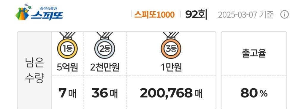 스피또1000 복권 92회 남은수량 1등 7매(총 9매 중), 2등 36매(총 45매 중), 3등 200,768매(총 247,500매 중)가 남아 있습니다. 출고율(판매점 입고율)은 80%입니다. 출고율의 의미와 당첨확률을 높이는 방법은 스피또 당첨확율을 높이는 방법은? 구입전에 출고율과 남은 수량을 확인은 필수! 글을 참고하세요.