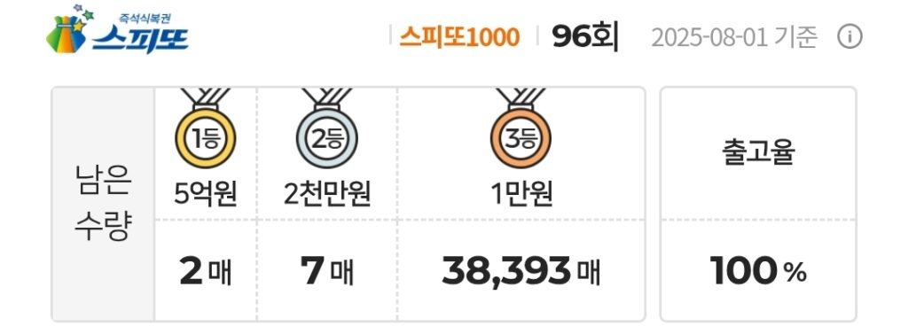 스피또1000 복권 96회 남은수량 1등 2매(총 10매 중), 2등 7매(총 50매 중), 3등 38,393매(총 275,000매 중)가 남아 있습니다. 출고율(판매점 입고율)은 100%입니다.