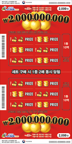 | 1등 | 오억원(500,000,000원) | 8매 | 4,000,000,000원 | 1/5,000,000 |