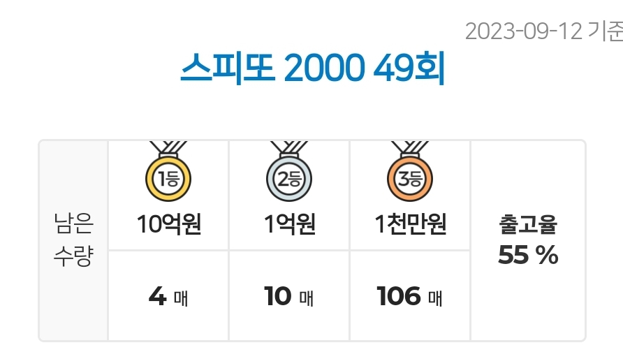 - 스피또2000 49회 1등 남은 수량 및 출고율 (2023.09.08 기준)