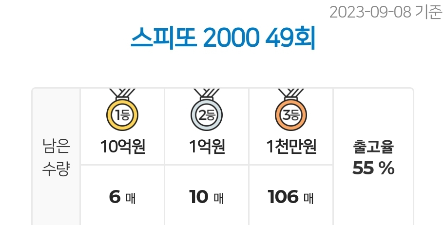 - 스피또2000 49회 1등 남은 수량 및 출고율 (2023.09.08 기준)