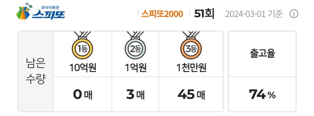 스피또2000 즉석복권 51회 남은수량 1등 0매(총 4매 중), 2등 3매(총 12매 중), 3등 45매(총 100매 중)가 남아있습니다. 출고율(판매점 입고율)은 74%입니다.