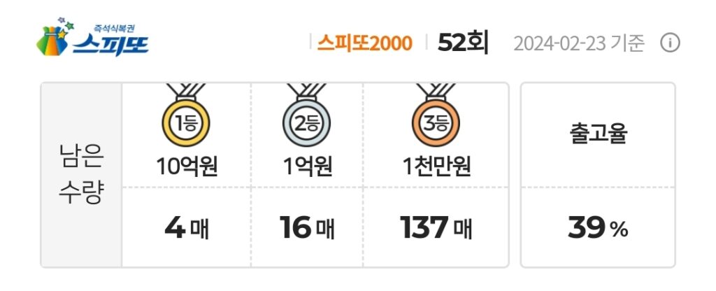 스피또2000 즉석복권 52회 남은수량 1등 4매(총 6매 중), 2등 16매(총 18매 중), 3등 137매(총 150매 중)가 남아있습니다. 출고율(판매점 입고율)은 39%입니다.