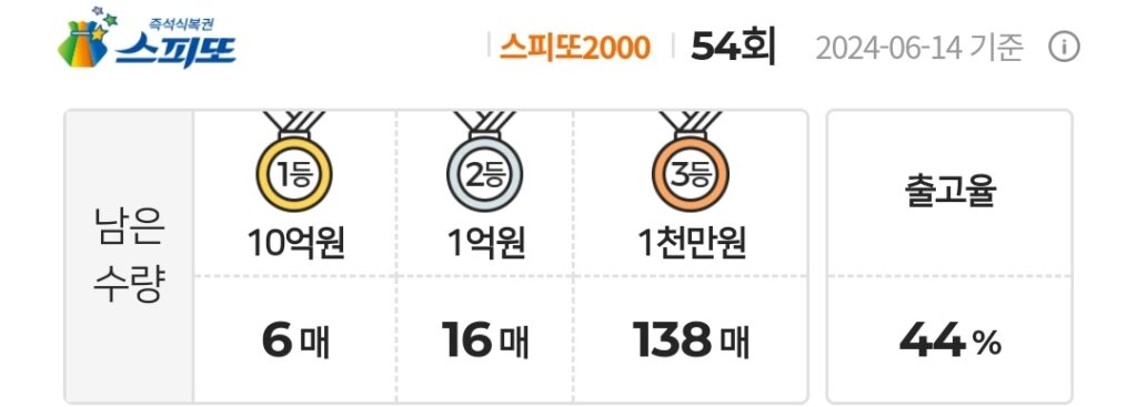 스피또2000 즉석복권 54회 남은수량 1등 6매(총 6매 중), 2등 16매(총 18매 중), 3등 138매(총 150매 중)가 남아있습니다. 출고율(판매점 입고율)은 44%입니다.