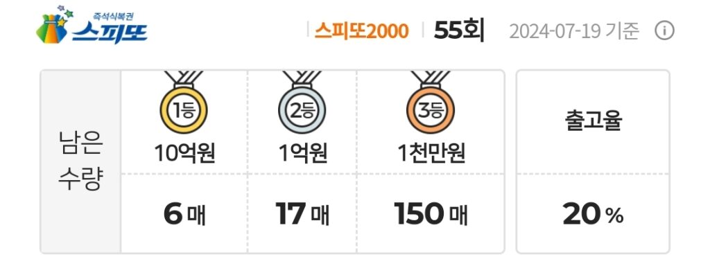 스피또2000 즉석복권 55 남은수량 1등 6매(총 6매 중), 2등 17매(총 18매 중), 3등 150매(총 150매 중)가 남아있습니다. 출고율(판매점 입고율)은 20%입니다.