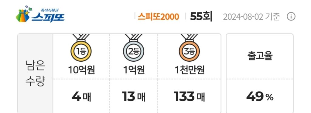 스피또2000 즉석복권 55 남은수량 1등 4매(총 6매 중), 2등 13매(총 18매 중), 3등 133매(총 150매 중)가 남아있습니다. 출고율(판매점 입고율)은 49%입니다.