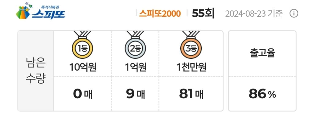 스피또2000 즉석복권 55회 남은수량 1등 0매(총 6매 중), 2등 9매(총 18매 중), 3등 81매(총 150매 중)가 남아있습니다. 출고율(판매점 입고율)은 86%입니다.