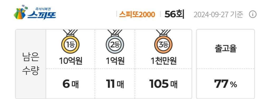스피또2000 즉석복권 56회 남은수량 1등 6매(총 6매 중), 2등 11매(총 18매 중), 3등 105매(총 150매 중)가 남아있습니다. 출고율(판매점 입고율)은 77%입니다.