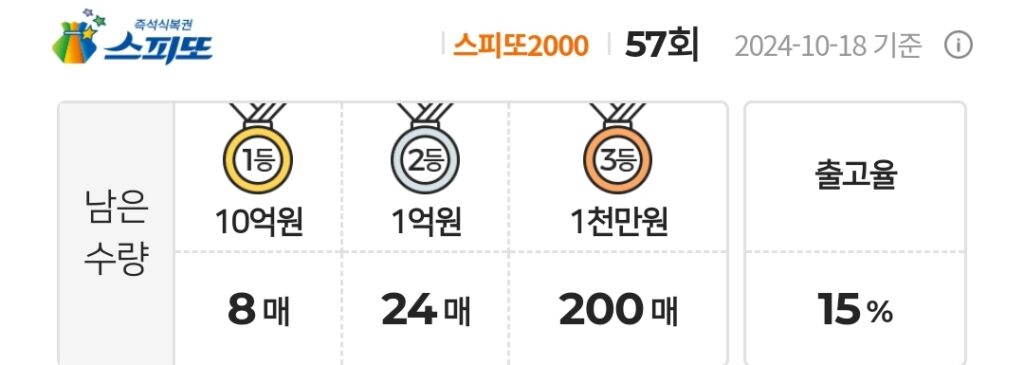 스피또2000 즉석복권 57회 남은수량 1등 8매(총 8매 중), 2등 24매(총 24매 중), 3등 200매(총 200매 중)가 남아있습니다. 출고율(판매점 입고율)은 15%입니다.
