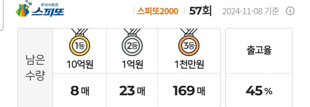스피또2000 즉석복권 57회 남은수량 1등 8매(총 8매 중), 2등 23매(총 24매 중), 3등 169매(총 200매 중)가 남아있습니다. 출고율(판매점 입고율)은 45%입니다.