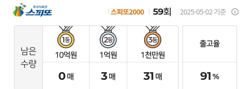 스피또2000 즉석복권 59회 남은수량 1등 0매(총 8매 중), 2등 3매(총 18매 중), 3등 31매(총 150매 중)가 남아있습니다. 출고율(판매점 입고율)은 91%입니다.
