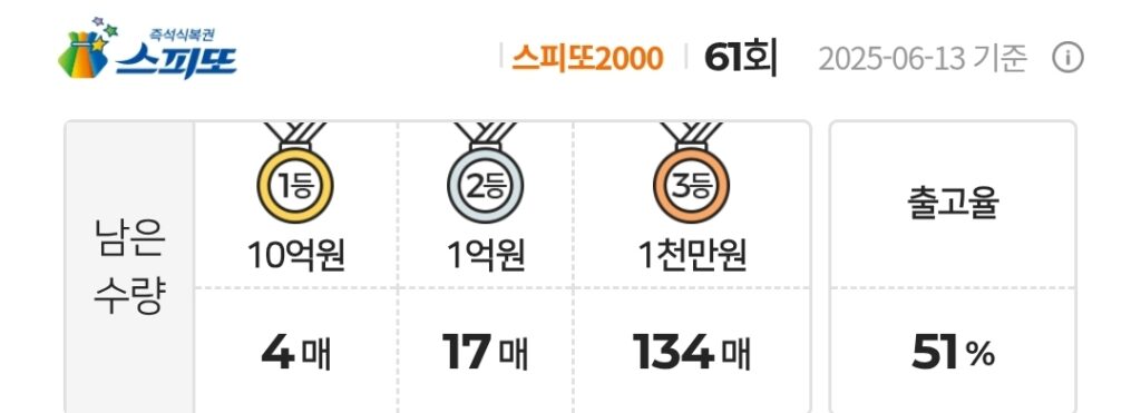 스피또2000 즉석복권 61회 남은수량 1등 4매(총 6매 중), 2등 17매(총 18매 중), 3등 134매(총 150매 중)가 남아있습니다. 출고율(판매점 입고율)은 51%입니다.
