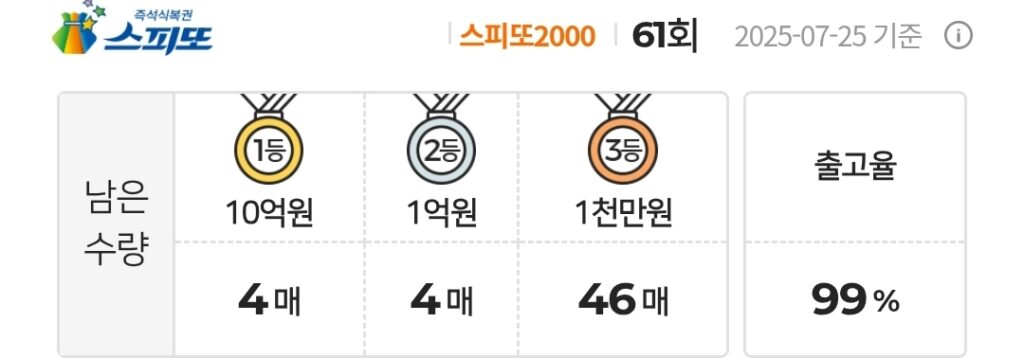 스피또2000 즉석복권 61회 남은수량 1등 4매(총 6매 중), 2등 4매(총 18매 중), 3등 46매(총 150매 중)가 남아있습니다. 출고율(판매점 입고율)은 99%입니다.