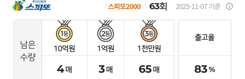 스피또2000 즉석복권 63회 남은수량 1등 4매(총 8매 중), 2등 3매(총 24매 중), 3등 65매(총 200매 중)가 남아있습니다. 출고율(판매점 입고율)은 83%입니다.