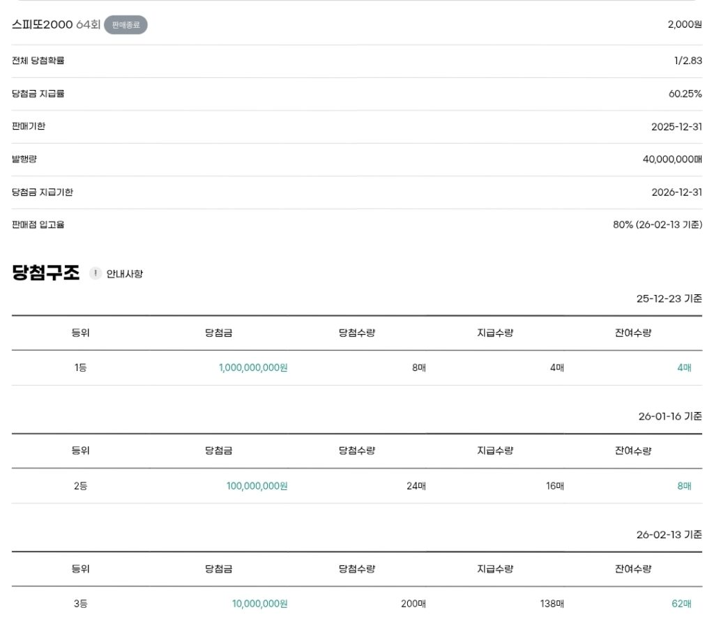 스피또2000 즉석복권 64회 출고율(판매점 입고율)은 80%입니다. 남은 수량은 아래 당첨구조를 참고하세요.