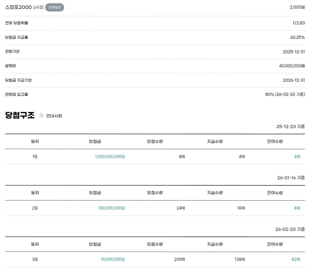 스피또2000 즉석복권 64회 출고율(판매점 입고율)은 80%입니다. 남은 수량은 아래 당첨구조를 참고하세요.